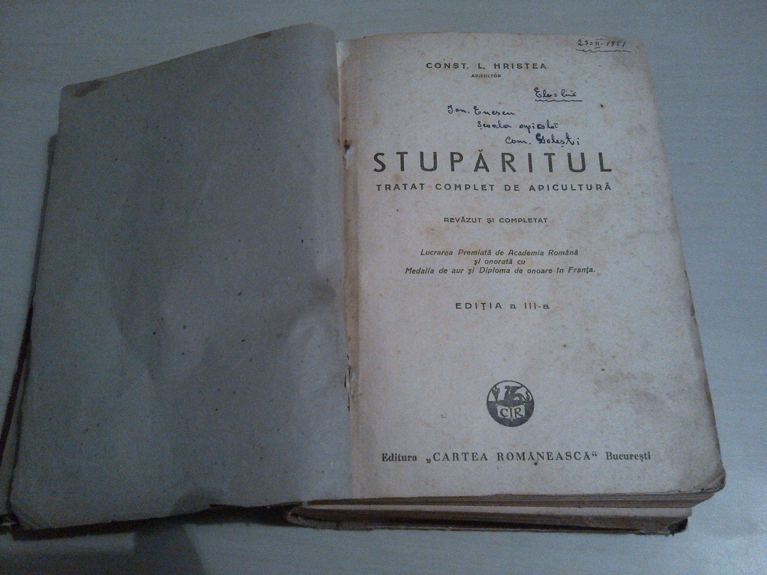 Marturie celor spuse de mine mai sus sta o carte veche de apicultura “STUPARITUL” scrisa de renumitul apicultor Const. L. Hristea, carte care mai poarta si astazi, foarte citet, pe prima pagina, dedicatia datata 29.II.1951, respectiv: “Elevului Ion Enescu – Scoala Apicola – Comuna Golesti”.